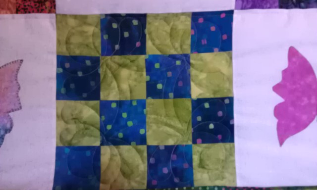 Here’s a closeup of the 16 patch blocks. I chose to quilt the same single block pattern in each 16 patch block. The thread chosen shows up well on some blocks and not on others because the fabrics ranged in color from bright yellow to dark purple. This works out well because the fabrics get displayed perfectly. Batik lovers will understand!