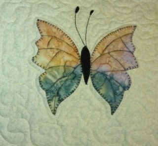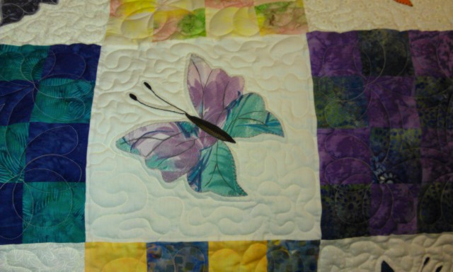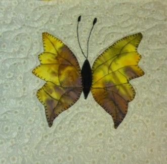 The following pictures show the echo stitching placed around the butterfly and freehand meandering around the block. I finished the butterfly by adding ‘veins’? in black thread.