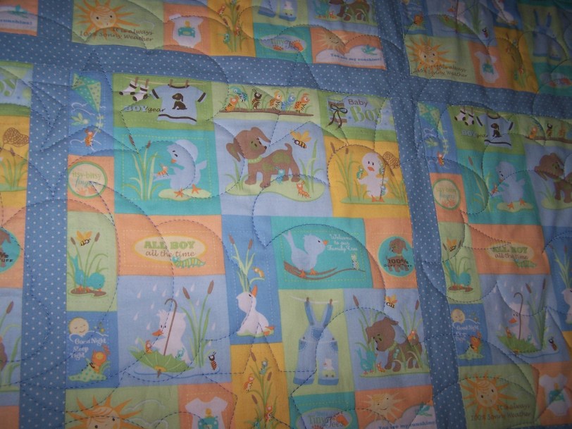 This quilt was quilted with an edge to edge pattern of stars, moons, and clouds. Remember ‘edge to edge’ quilt patterns quilt without regard to the quilt top patterns. This works well for LOTS of quilt tops and is the least expensive way to get quilt tops quilted and FINISHED! CONTACT ME today for an estimate.