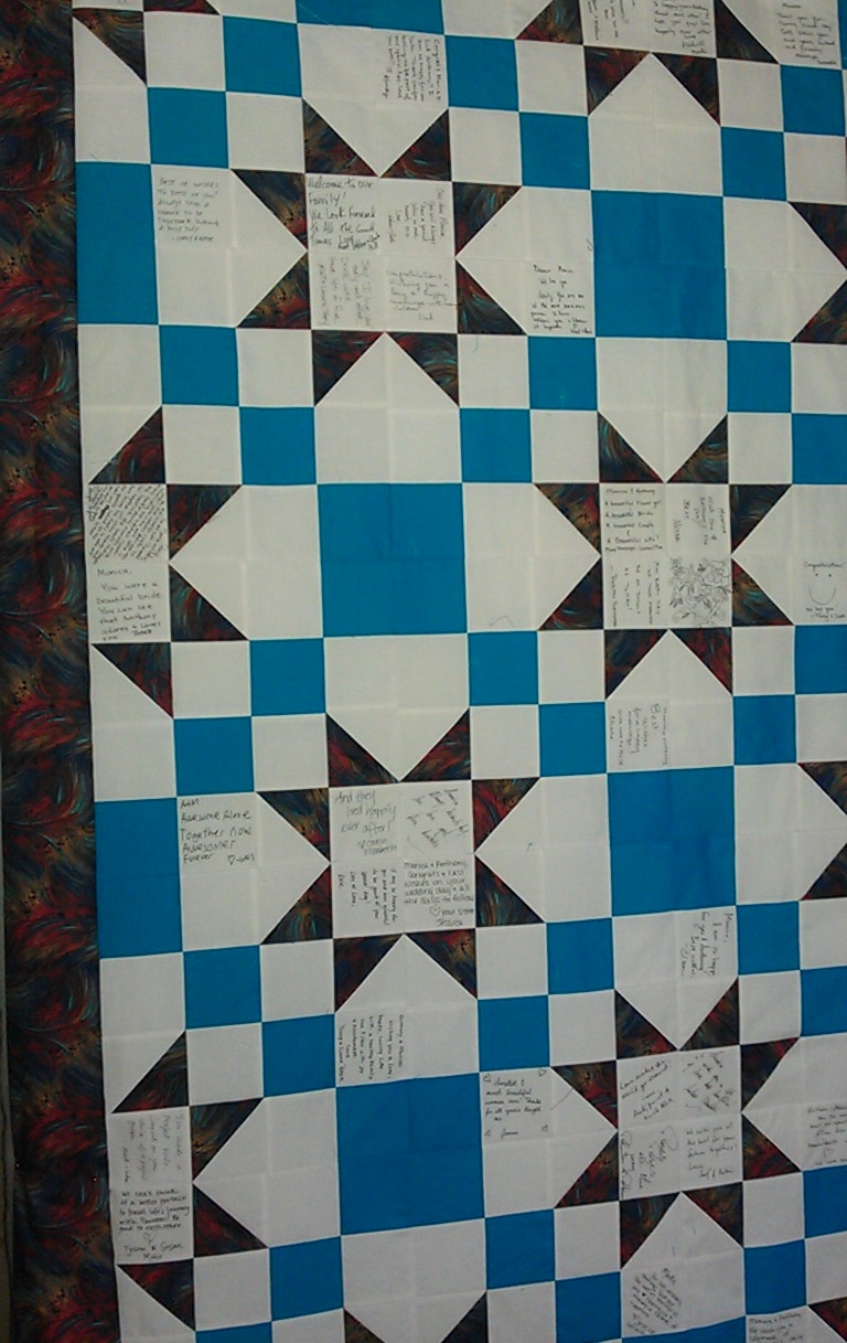 Here are two custom made wedding signature quilts for a special couple. Guests at their wedding were asked to sign well wishes on squares of prepared fabric. The squares were trimmed to size and made up the Road to California quilt blocks.