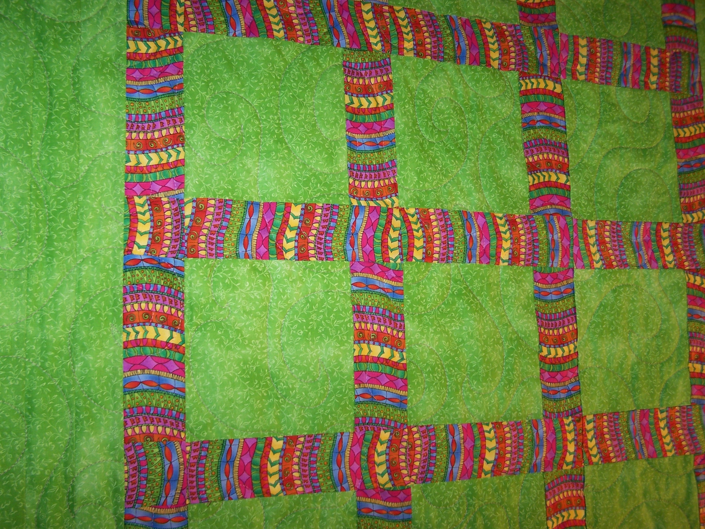 Aren’t the colors awesome in this quilt! Multi-color sashing around bright great fabric squares.