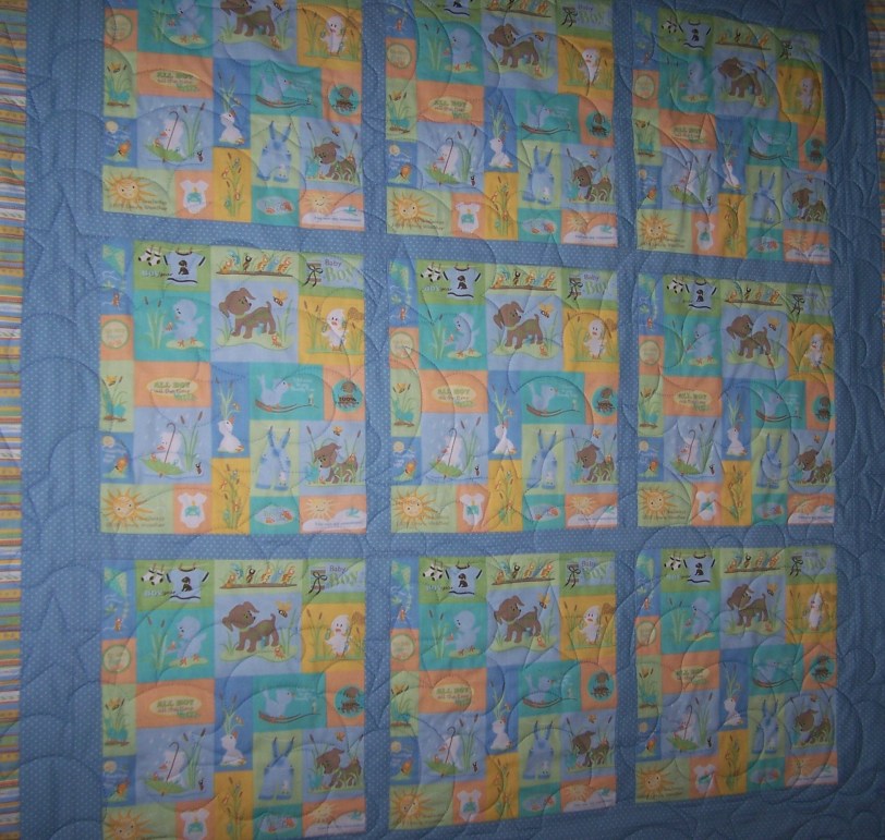 This is a little boy’s quilt that has solid blue sashing around great squares of fabric.