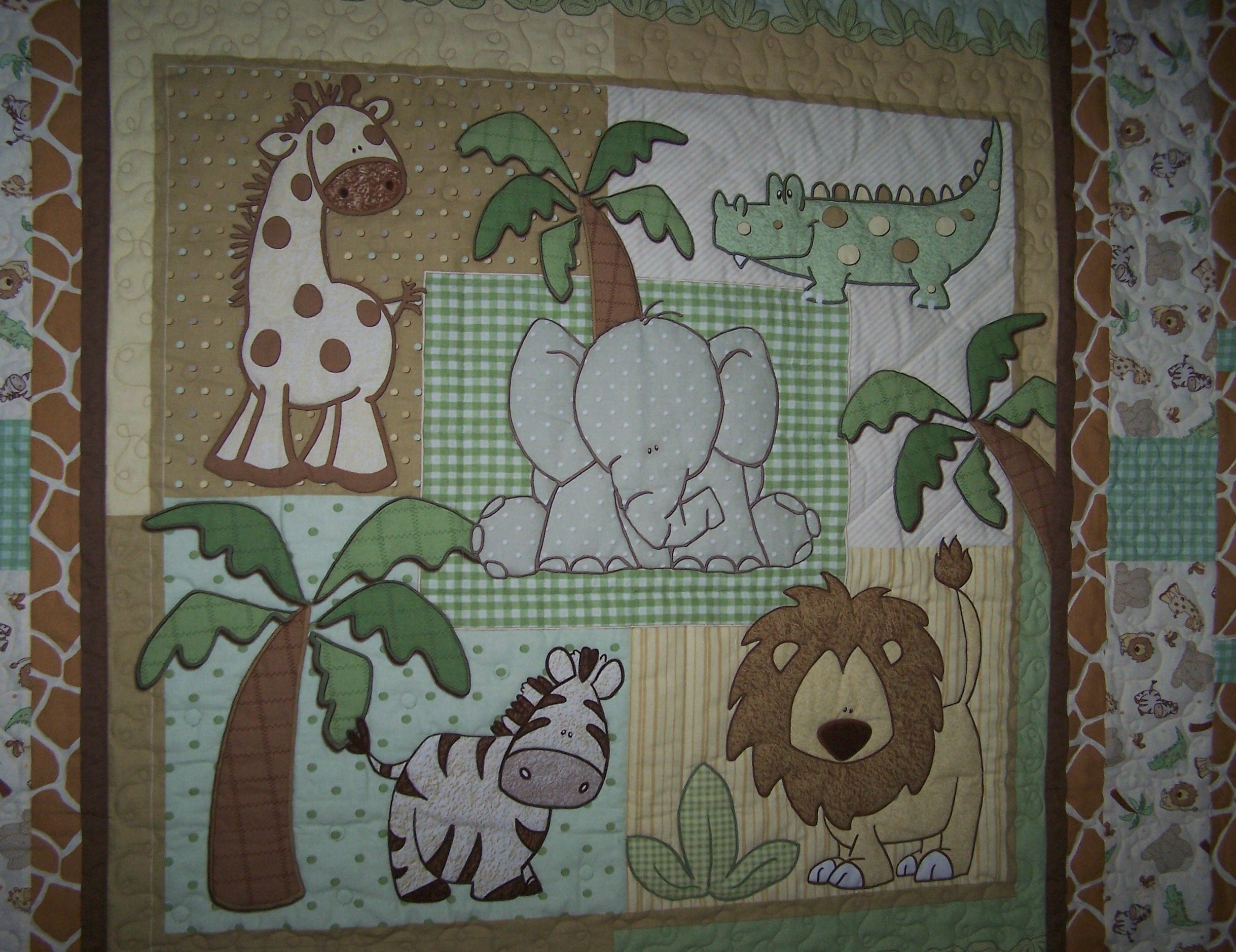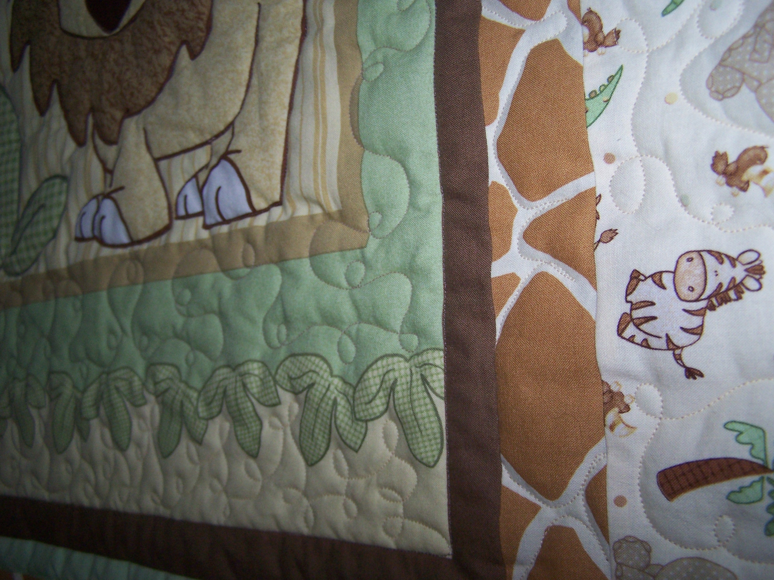 The center panel animals and all the trees were outlined stitched. Each background section was also custom stitched…some with 1/2″ circles (giraffe and zebra), diagonal lines (alligator), checkered stitching (elephant), or straight lines (lion).