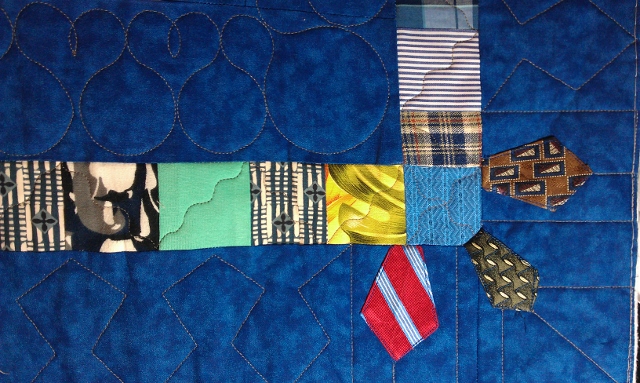 I love the way she took tie fabric and made ties in the corners of the outer border! NEAT!