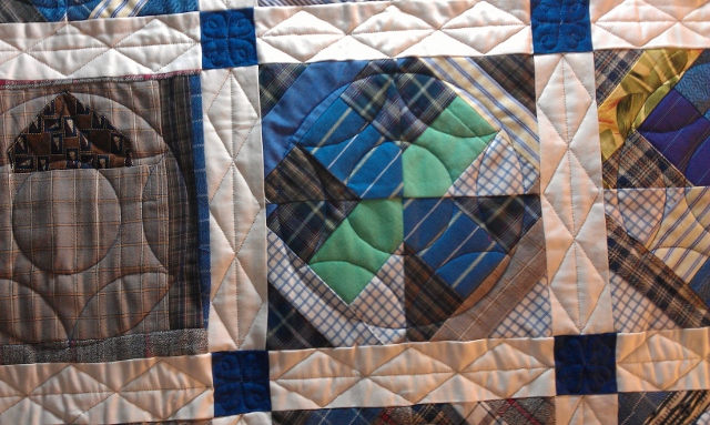 The Topper then sashed the blocks with cornerstones and used squares of clothing to make the middle border! Do you see the ties in the pockets in some of the blocks? Isn’t that clever!